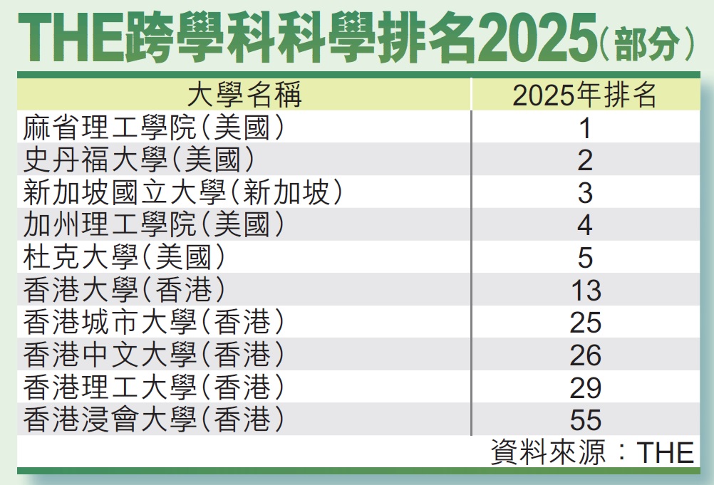 跨學科研究于全球日趨重要,英國《泰晤士高等教育》(THE)昨公布今年首設的“跨學科科學排名2025”,香港共有5間大學參與,其中4間打入全球50強。香港大學排第13位,除了排行香港首位,亦位列亞洲第2位;城市大學排第25位,位列香港第2位,中文大學及理工大學緊隨其后,分別排第26位及第29位。城大校長梅彥昌表示,大學必須打通學科之間的壁壘,以培育跨學科人才。中大表示,將繼續追求卓越,在跨學科研究和教學精益求精。