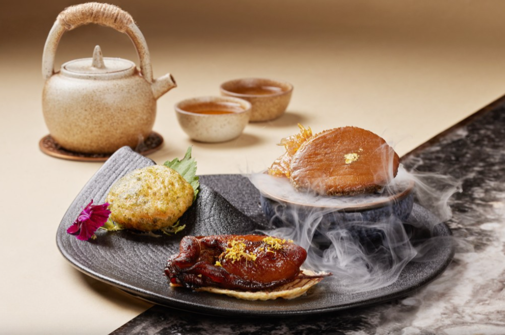 昆侖鮑脯曾是滿漢全席中的經典佳肴,主要材料是龍躉皮和鮑魚。陳師傅選用重達9公斤的干龍躉皮,經過多重處理工序后,配搭鮑魚、魚湯和鮑汁以古法燴煮,既入味又保留食材原有風味,吃起來煙韌具嚼勁。雞窩包是失傳中菜,大廚將面包皮手搓成撻,上面放上鵪鶉蛋、冬菇、雞粒和豬肉餡,再淋上鮑魚汁烹調,原汁原味。