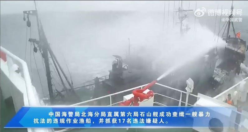 “中國海警”11月23日發放出數十秒的視頻,通報稱,中國海警局北海分局直屬第六局所屬石山艦,近日在黃海中部海域執行巡航任務時,成功查緝一艘暴力抗法的違規作業漁船,現場抓獲違法嫌疑人17名。