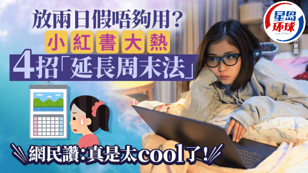 現今大部分打工仔一星期都只得周六及周日兩天假,有些人甚至只得“單休”,但“開心的時間過得特別快”,總覺得時間不夠用,或是睡得晚一點,一日很快便過去了。所以日前,有網民在小紅書上以“我發現了‘延長周末’的4個方法”為題,發文教其他網友如何延長這兩天假期的可行方法。