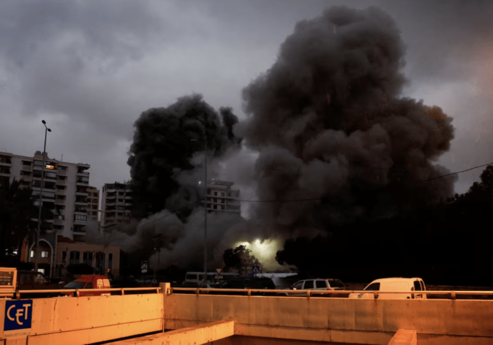 ▲2024年11月25日,黎巴嫩貝魯特南郊,真主黨與以色列軍隊持續敵對,以色列襲擊一棟建筑后冒出濃煙。 路透社
