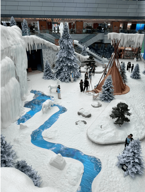 近日,位于深圳南山區的商場“萬象前?!本统饩拶Y吸客,于今個冬天在中庭位置打造面積約1,300平方米的冰雪造景,加入麋鹿、雪兔、雪地露營帳篷、圣誕樹等的裝飾擺設,不定時還會噴灑人造雪,打造飄雪效果,讓賓客猶如置身冬日雪地當中。
