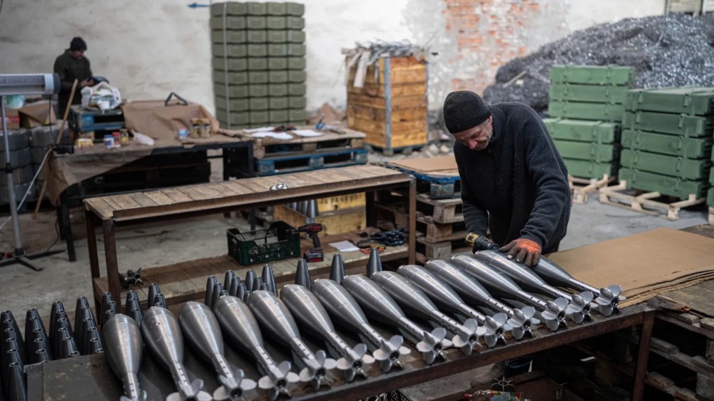 ▲工人在烏克蘭一間工廠內組裝迫擊炮彈。 美聯社