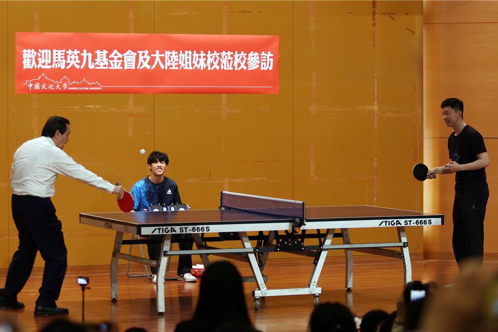 ▲大陸乒乓球名將馬龍近日跟隨陸生團訪臺,29日前往文化大學進行交流,并與臺灣退役乒乓球名將蔣澎龍與巴黎奧運國手陳思羽切磋球技,上演奧運層級的交流賽。馬英九(左)開球與馬龍(右)切磋一下。