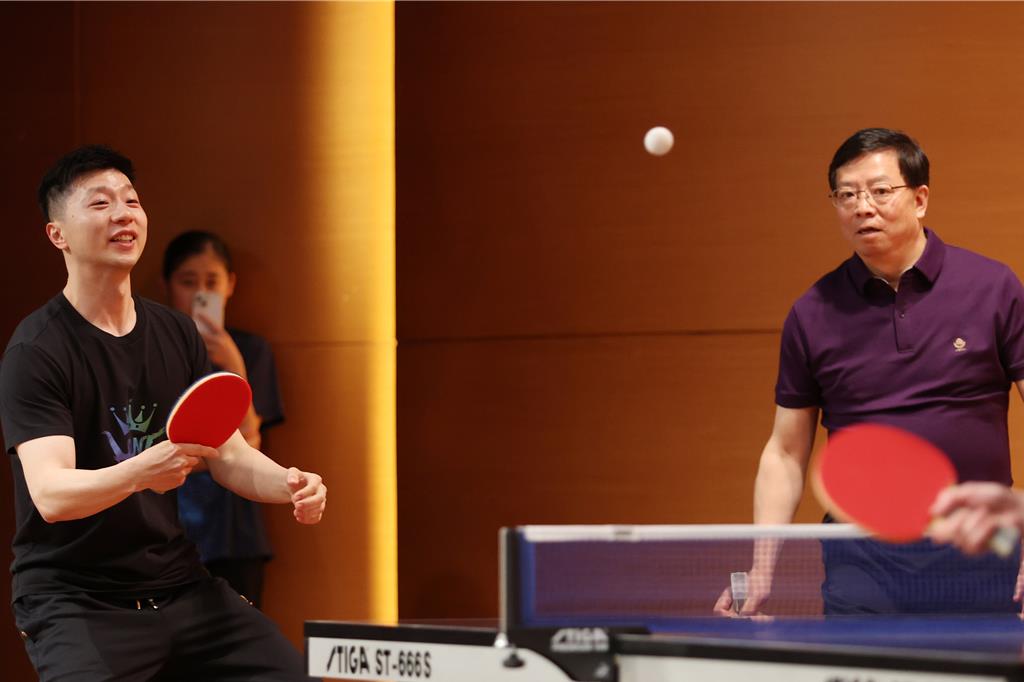 ▲大陸乒乓球名將馬龍(左)近日跟隨陸生團訪臺,29日前往文化大學進行交流,并與臺灣退役乒乓球名將蔣澎龍與巴黎奧運國手陳思羽切磋球技,上演奧運層級的交流賽。