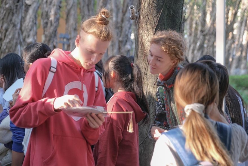 But the festival wasn't just about food. It also featured an impressive array of cultural displays. The Peru booth captivated visitors with colorful posters that highlighted the country's geography and history. Students from Vietnam and Russia donned traditional costumes and danced alongside Chinese students, creating an atmosphere of joy and camaraderie. Their energetic performances and laughter drew smiles from everyone present. A standout attraction was the "Intangible Cultural Heritage Booth" set up by Chinese students, where intricate lacquer fan art was on display, adding a rich layer of traditional Chinese culture to the festivities.