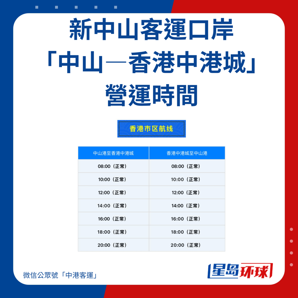 首班船只已于11月28日上午10時開出前往香港中港城,新口岸開通后,將會有3個新航線,包括“中山—香港中港城”、“中山—香港機場”及“中山—深圳蛇口”,計劃每日往返22個航班, 當中香港線有9班來回,而蛇口線則2班來回,也會按需求逐步加密班次。