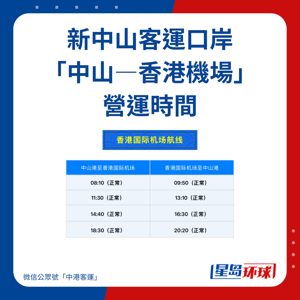 新中山客運口岸位于中山馬鞍港區,是目前廣東省規模最大的水運口岸,開通之后,往返香港的船程時間亦會縮減,例如中港城的航程由85分鐘減至65分鐘;往香港國際機場的航程則由70分鐘縮短至50分鐘;新增往深圳蛇口航線,航程約50分鐘,省卻不少交通時間。