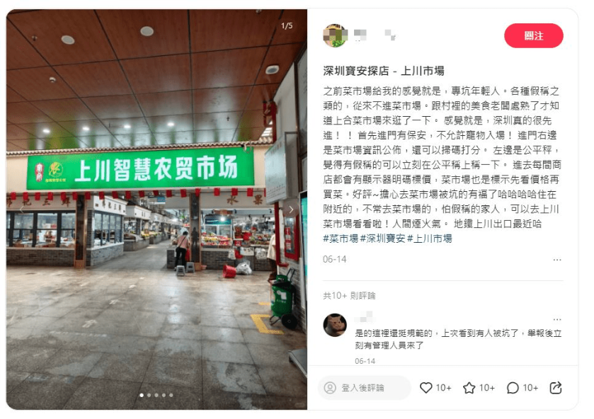 另一位小紅書帖主則稱自己以往因怕被騙,所以從來不進菜市場,“之前菜市場給我的感覺就是??幽贻p人,各種假秤之類的,從來不進菜市場?!焙髞斫浫私榻B,他首次逛了上川市場,即對其贊不絕口,“來逛了下。感覺就是,深圳真的很先進!”他稱贊市場進門即有保安,且不允許寵物入場;另外場內設有菜市場信息公布,每間商店也有顯示器明碼標價,并擺放了公平秤,“覺得有假秤的可以立刻在公平秤上秤下?!鳖櫩蜕踔量蓪ι虘魭叽a打分,讓他直言不再怕被“坑”了!