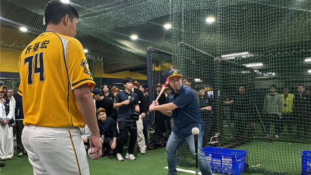 ▲大陸高校師生訪問團1日分別前往南投日月潭和臺中洲際棒球場體驗棒球樂,馬英九基金會執行長蕭旭岑也忍不住上前體驗棒球樂。中時