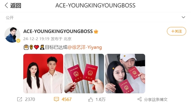 黃子韜、徐藝洋特別選在今日晚間19點19分,在微博同步發文,公開已經領證的好消息,曬出紅底結婚照以及拿著結婚證的甜蜜自拍。黃子韜配文驕傲表示:“目標已達成!”,徐藝洋則害羞喊道:“想談一場以結婚為目的的戀愛”。