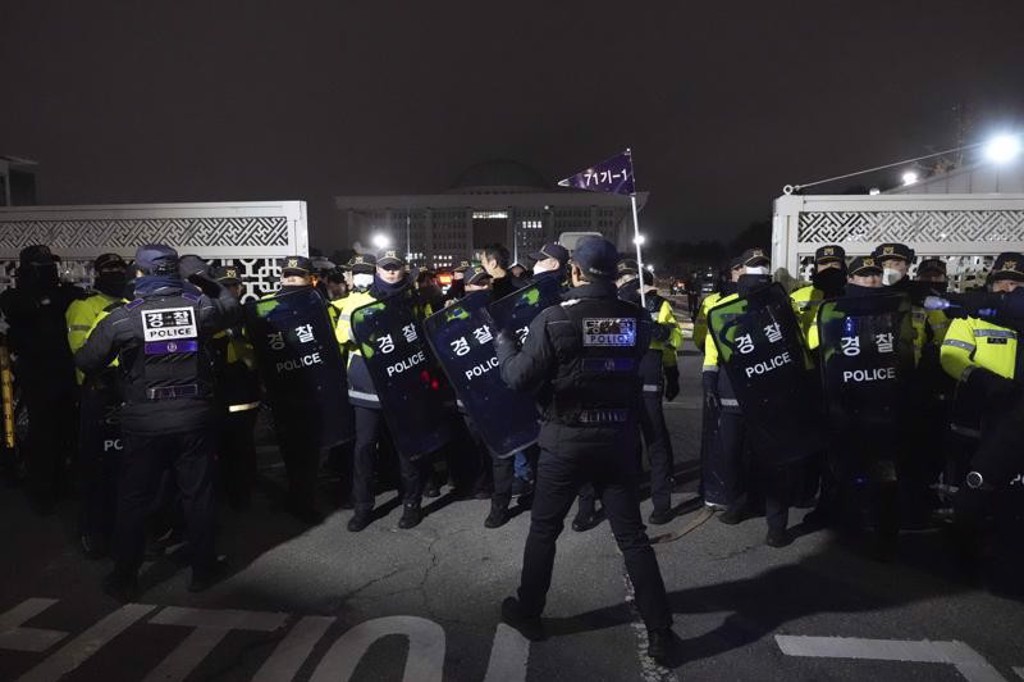 ▲韓國總統尹錫悅3日宣布戒嚴,韓國警方在首爾國會前戒備。(圖/美聯社)