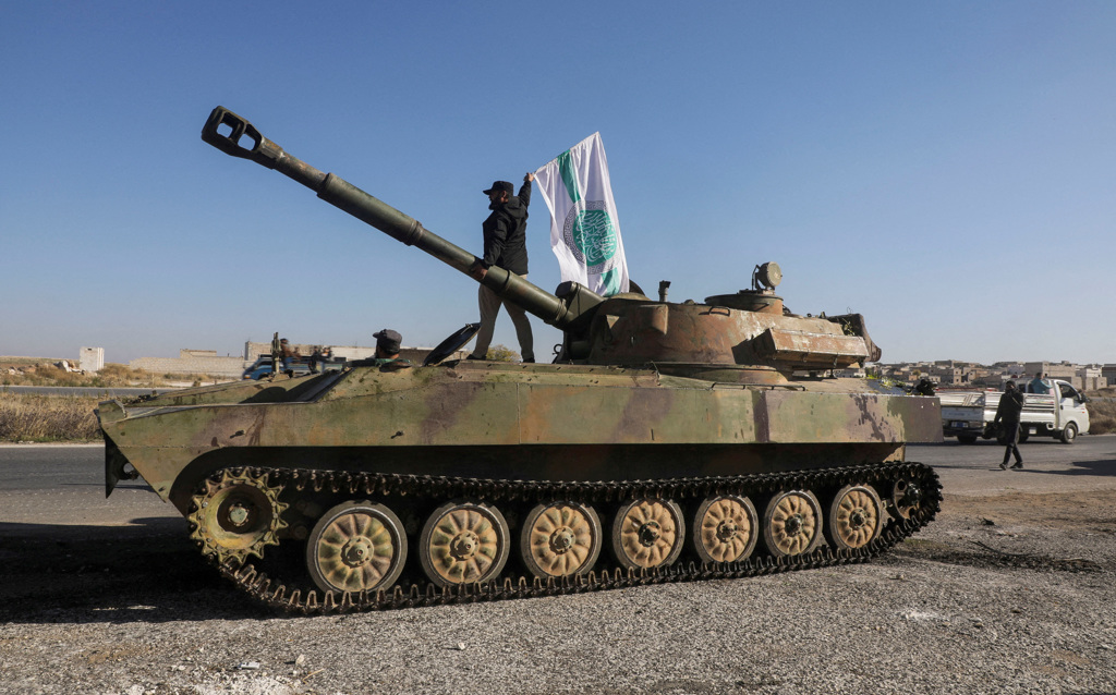 ▲2024年12月1日,敘利亞西北部伊德利卜省一名反抗軍戰士站在一輛軍車上,舉著沙姆解放組織旗幟。(路透社)