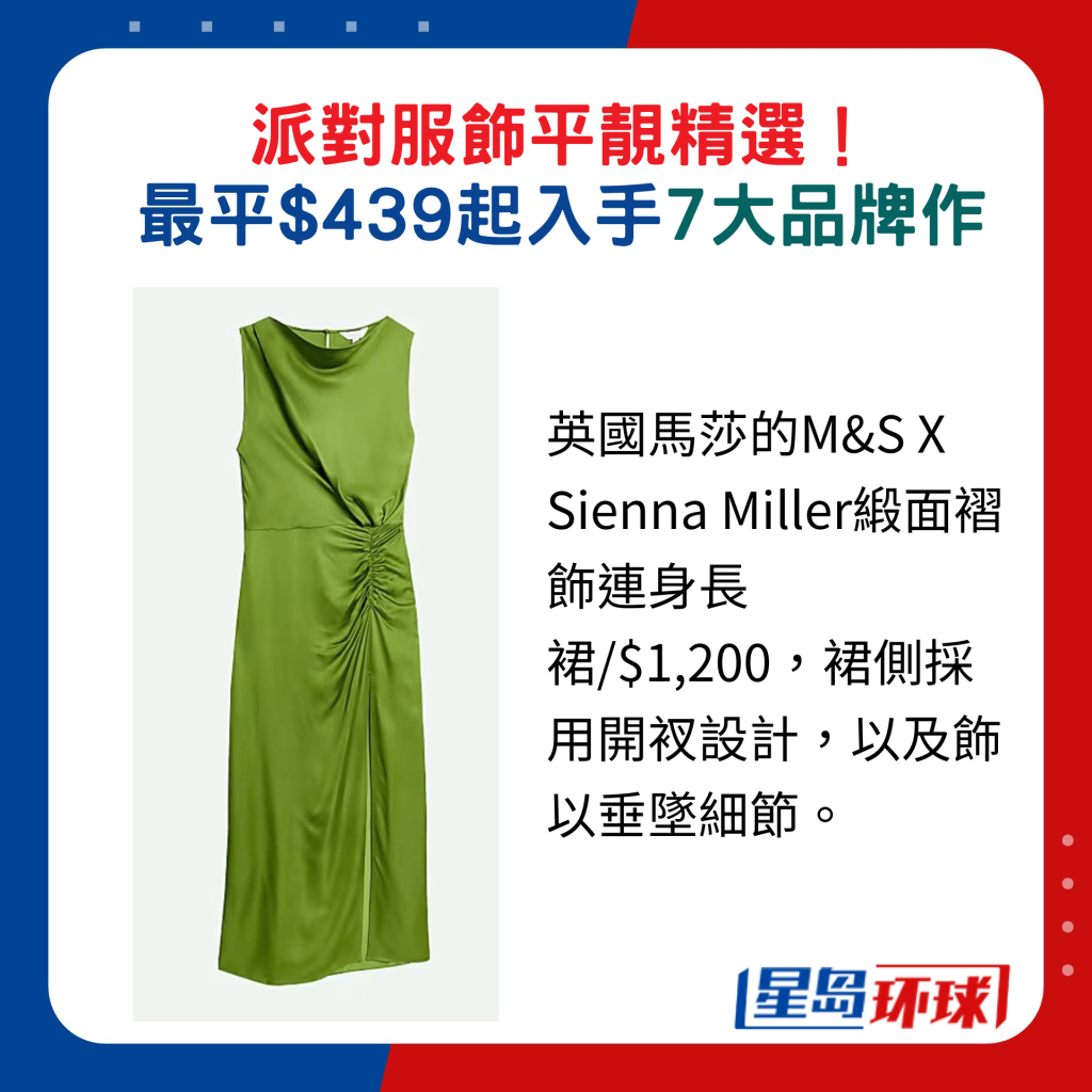 選對一件派對“戰衣”,絕對是整體造型的靈魂所在! 留意服裝設計選用的面料,如絲絨、綺面、喱士及薄紗等質感高貴之 選,都有助提升格調。 英國馬莎伙拍著名女星Sienna Miller推出的新系列,正包羅多元化的派對服,其中一款光亮綺面連身長裙,綠色設計搶盡視線,加上裙側配以垂墜及開衩細節,展現點到即止的性感。 另一件黑色喱士高領透視上衣,以人手釘上珠粒裝飾,衣袖配搭絲絨束繩設計,添注優雅美感。 若內襯短身吊帶上衣,下襯皮革褲或短裙,即時散發型格魅力。H&M新登場的Studio節日膠囊系列,將經典剪裁融入創新設計, 配搭金銀色調細節點綴,其中酒紅色無袖晚裝裙大玩同色系拼料設計,以羅紋針織拼搭雙層薄紗裙擺,裙身飾以刺繡圖案及閃亮紗線,玩味與優雅兼備。