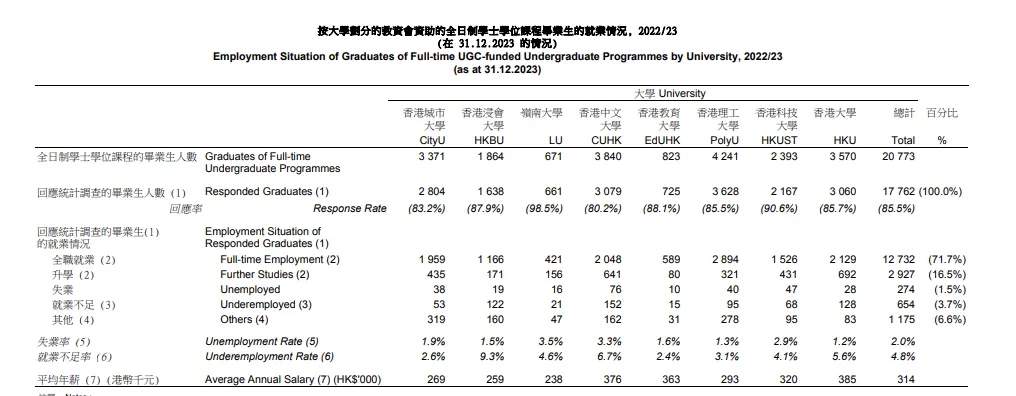 星島教育經調查,找到香港大學教育資助委員會公布2022/2023學年香港八所資助大學學士課程畢業生的就業情況。去年八大畢業生平均年薪為31.4萬元(港幣,下同) ,即月入約2.6萬元,較之前一年升3.6%,其中香港大學畢業生年薪38.5萬元排名首位,其次為香港中文大學(37.6萬元)和香港教育大學(36.3萬元)。