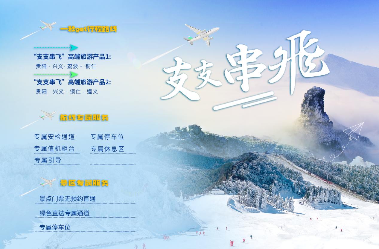 “支支串飛“”飛行串聯“黃小西吃晚飯”(黃果樹大瀑布、荔波小七孔、西江千戶苗寨、赤水丹霞、興義萬峰林、梵凈山)等重點旅游景區。為讓入黔旅程更加簡單快捷?!爸еТw”貼心提供候機專屬、景區專屬、特色餐飲和品質住宿等服務,為游客提供舒適獨特體驗,感受貴州美好。