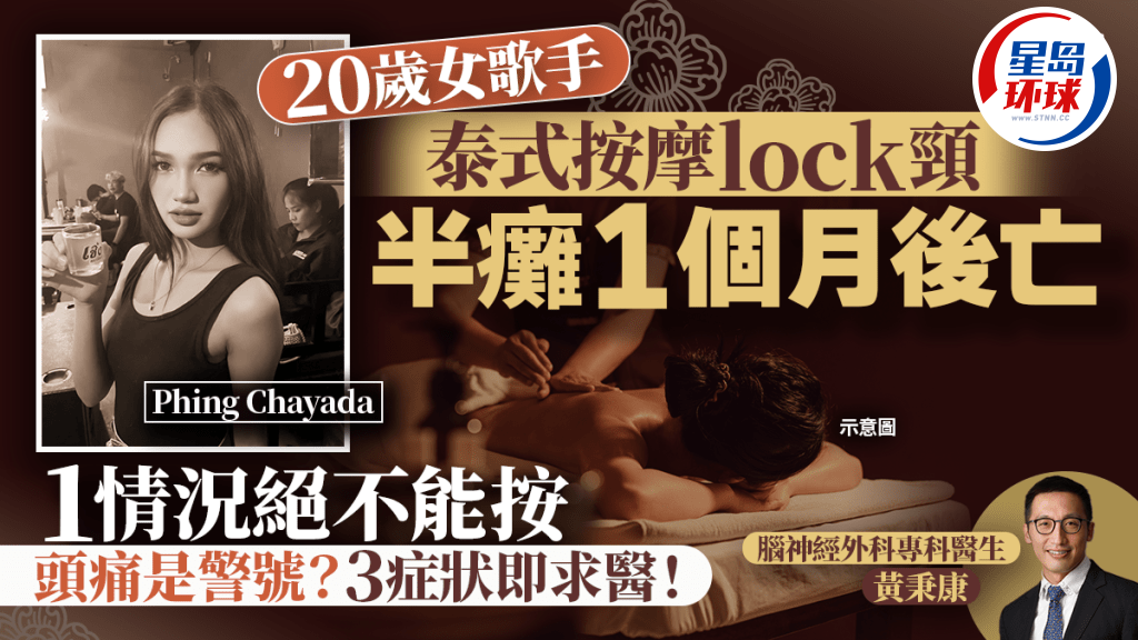 按摩紓緩放松,卻引發致命危機! 泰國女歌手Phing Chayada11月初在當地做泰式按摩,包括“lock頸”動作,后來半身癱瘓,于昨日(12月8日)離世,享年20歲。 香港腦神經外科??漆t生黃秉康接受《星島頭條》訪問時,講解泰式按摩的危險性,指出有1類人不適合按摩。 若按摩后出現3種跡象,則可能已受傷,宜立即求醫。