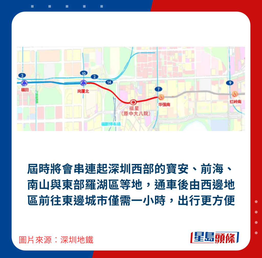 至于另一個新站華強南站,則可于此站轉乘7號線,往返南山區、福田區、羅湖區等。加上崗廈北站是5線轉乘的中心點,可接駁1號、2號、8號、10號及14號線,覆蓋了深圳最繁忙的商業及交通樞紐,并同時打通羅湖區到機場的直通線路,日后羅湖居民前往機場毋需再多線轉乘,更快捷舒適。