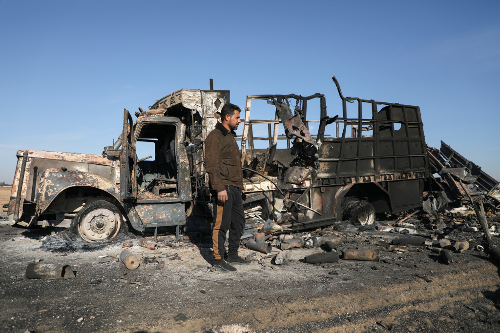▲2024年12月10日,區域安全消息人士和原敘利亞軍隊內部官員表示,以色列連夜持續對敘利亞各地的軍事設施和空軍基地進行空襲,一名男子在 卡米什利國際機場附近檢視一輛燒毀的卡車。路透社