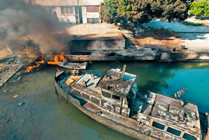 ▲敘利亞西北部拉塔基亞港口遭以軍空襲,可見被摧毀的敘海軍艦艇。