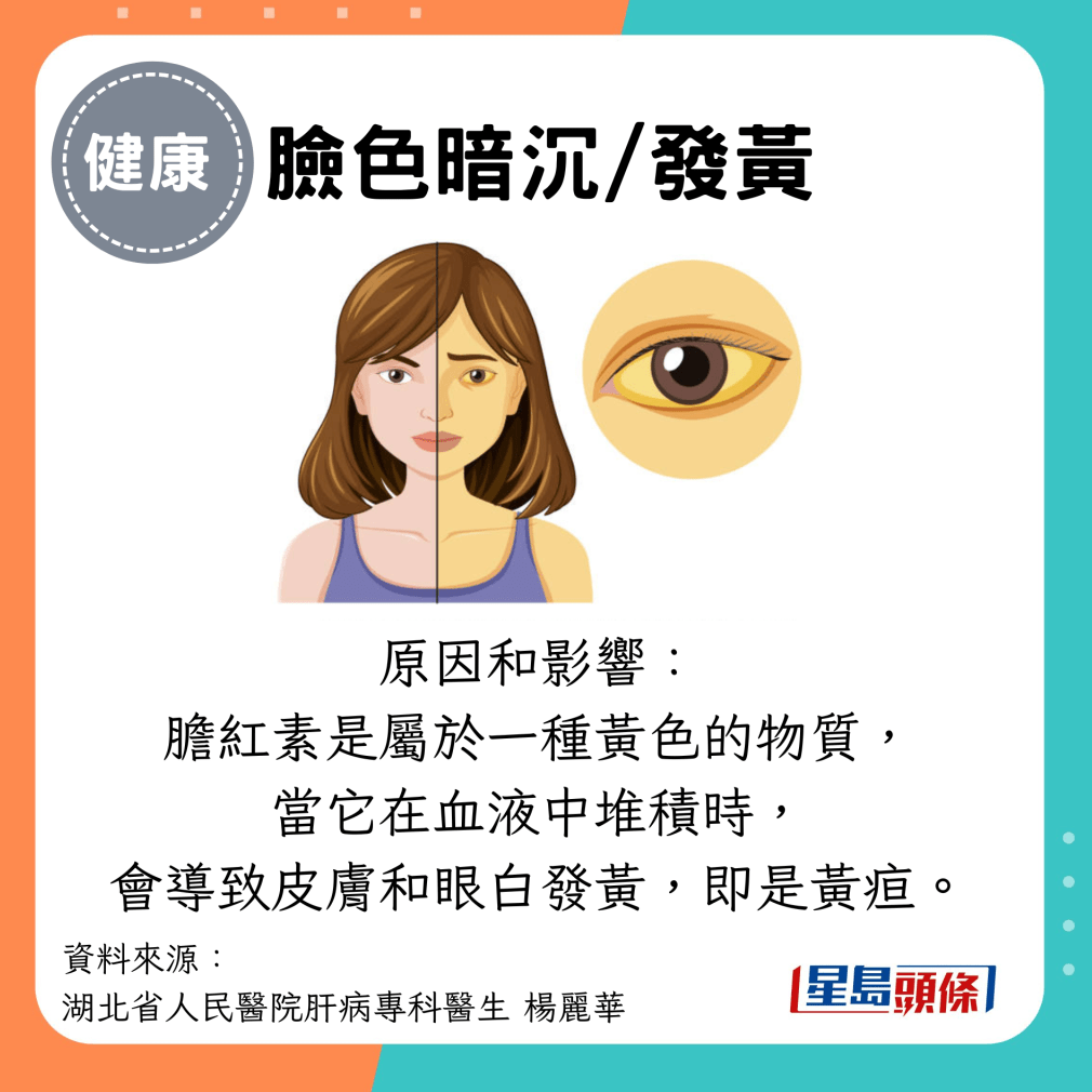 肝臟功能受損,膽紅素的代謝會出現異常,而膽紅素是屬于一種黃色的物質,當它在血液中堆積時,會導致皮膚和眼白發黃,即是黃疸。