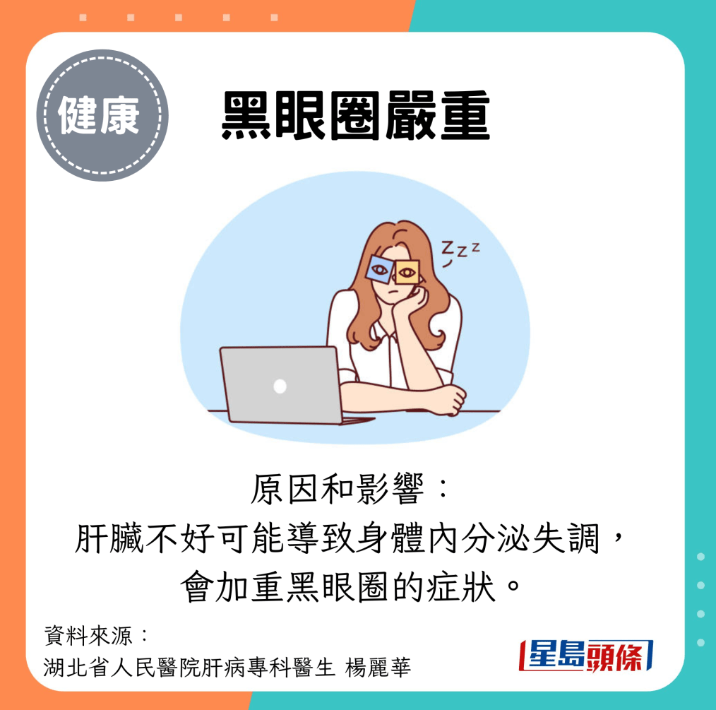 當肝臟受損時,會導致血液循環不良,尤其是眼睛周圍的血液循環受到影響,而出現黑眼圈。
