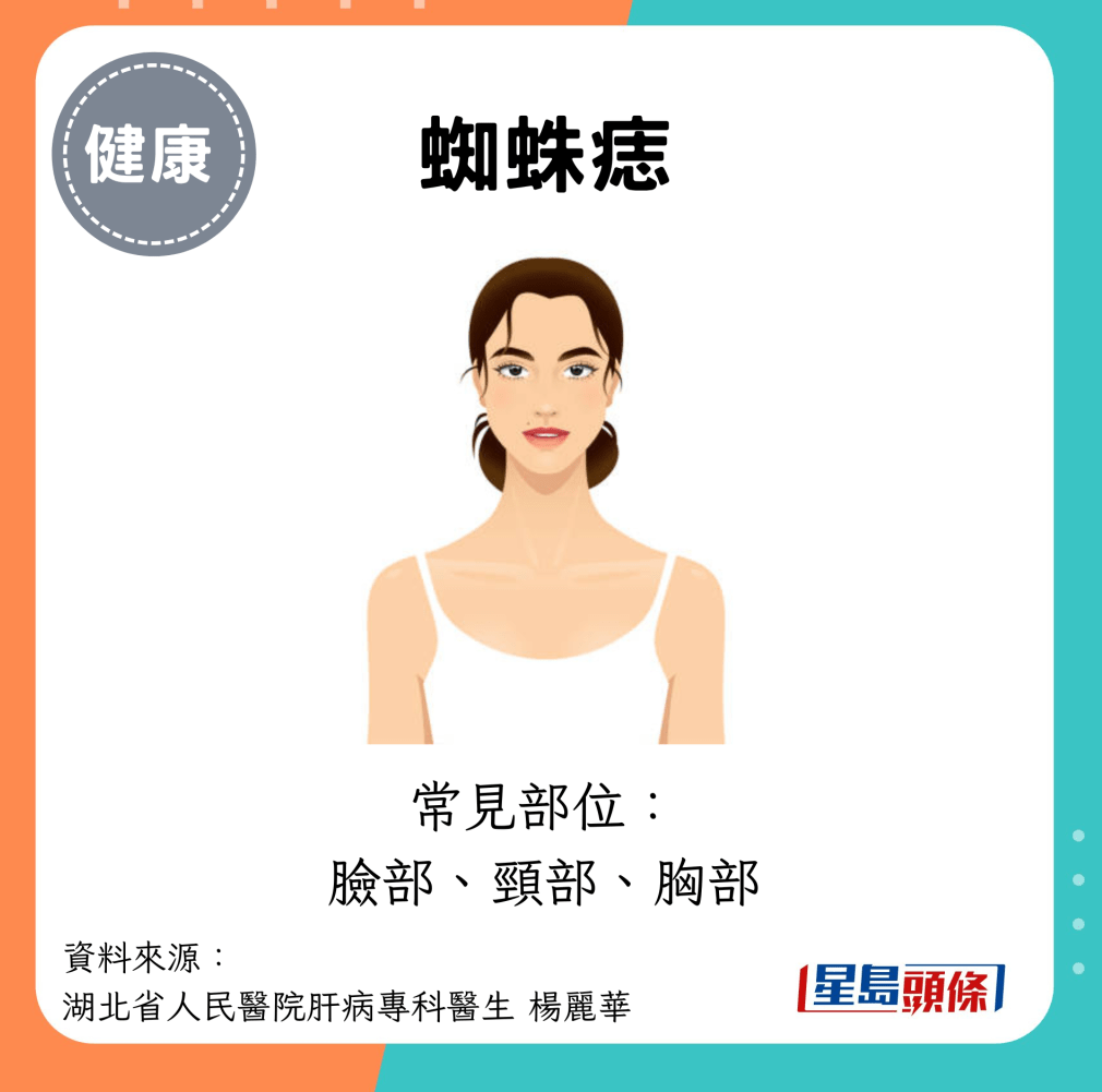 特征:屬于一種皮膚病變,表現為中心有一個紅點,周圍有放射狀的細小血管分支,看起來像一只蜘蛛。