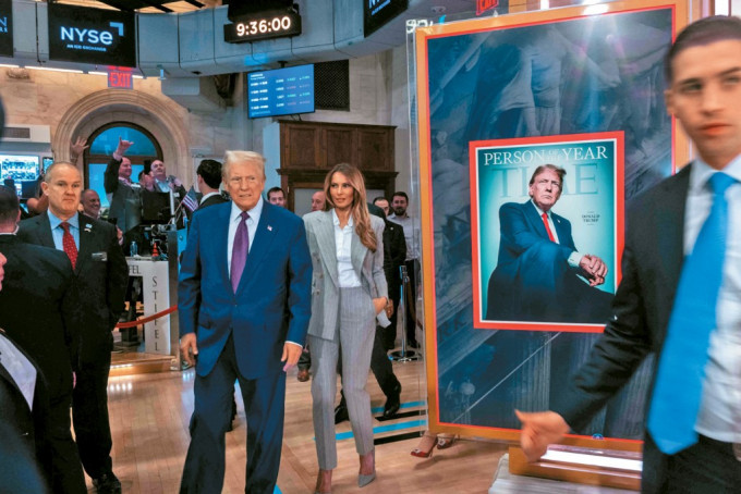 ▲特朗普與夫人梅拉尼婭周四進入紐約證券交易所,為當天的美國股市敲鐘開盤。