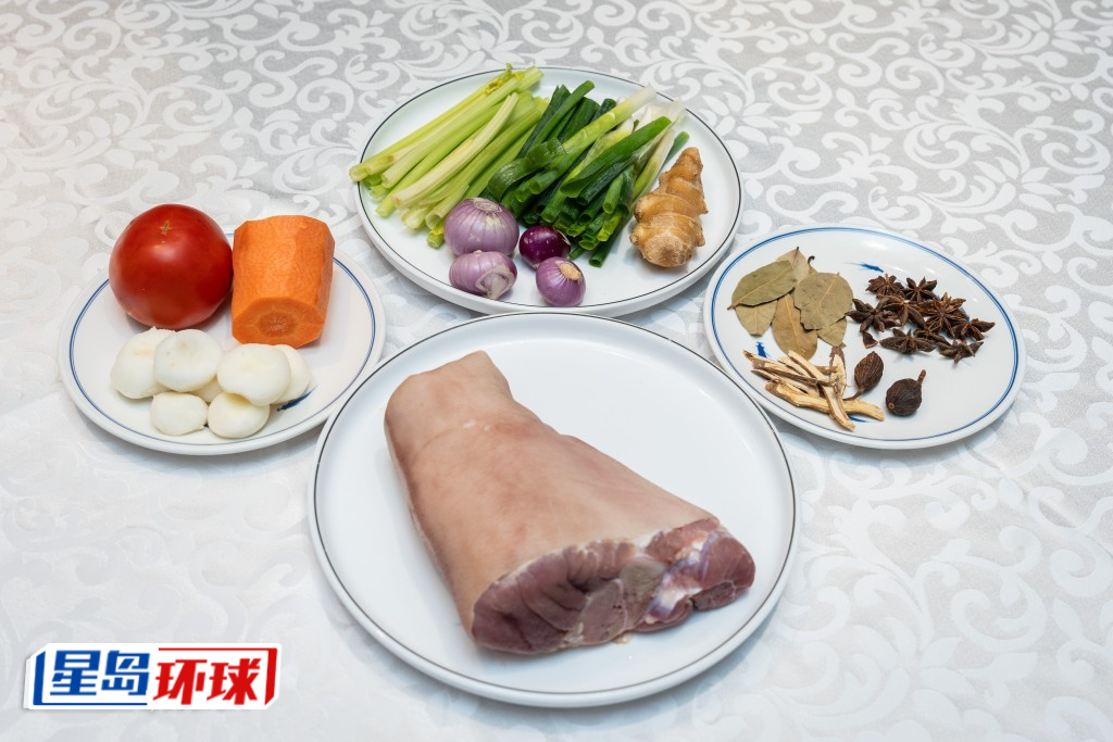 把咸豬手、干蔥、蒜頭、生姜、蔥、唐芹、馬蹄、甘筍、西紅柿、甘草、草果、八角及香葉放在盤內。