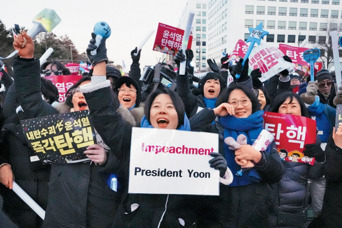 ▲在國會外集會的民眾,周六知悉國會通過總統尹錫悅的彈劾案后歡呼雀躍。