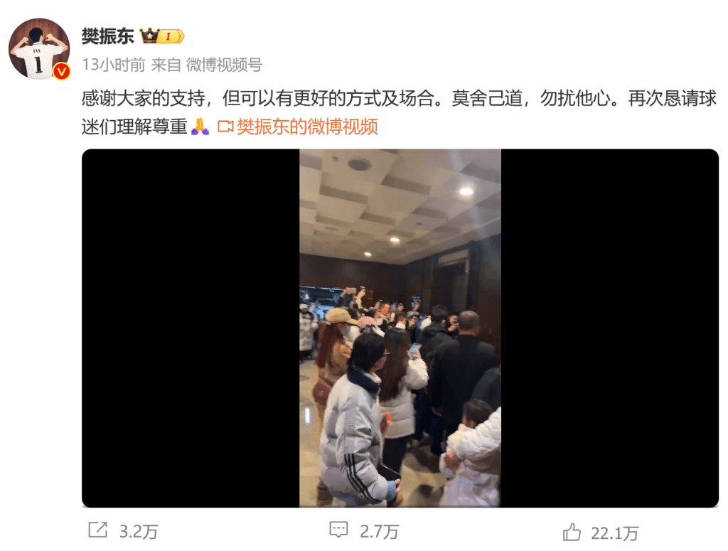 2021年全運會期間,樊振東則在機場遭遇了熱情球迷的“圍追堵截”?,F場一度陷入混亂,還出現了不得體的擁擠和身體接觸等。事后,樊振東同樣第一時間發文,希望球迷“要有分寸感,把握住應有的禮貌邊界”。