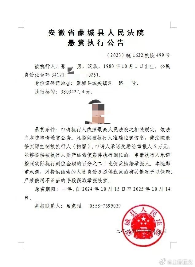 ▲據指是代孕機構幕后老板的張某,曾被蒙城縣人民法院列為失信人名單。