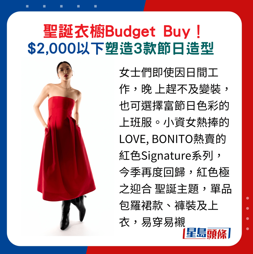女士們即使因日間工作,晚 上趕不及變裝,也可選擇富節日色 彩的上班服。小資女熱捧的LOVE, BONITO熱賣的紅色Signature系列,今季再度回歸,紅色極之迎合 圣誕主題,單品包羅裙款、褲裝及上衣,易穿易襯,其中售價$559的 V領連身裙采以修腰設計,盡展身形美態。鞋袋可配襯以閃亮元素設計的款式,如綴水晶尖頭高跟鞋。若想提升華麗指數,可配搭一件黑色 毛茸大衣,全身衣飾“埋單”都不用 $1,800!