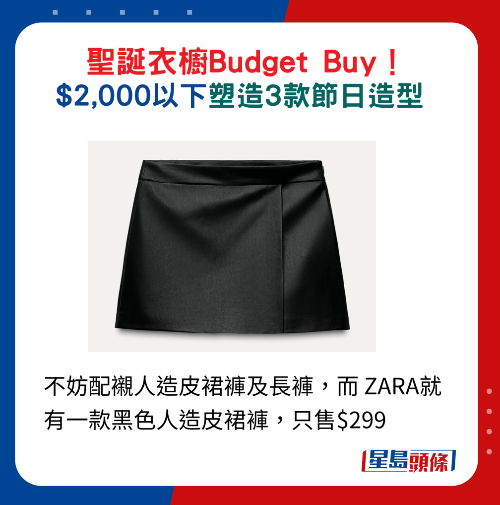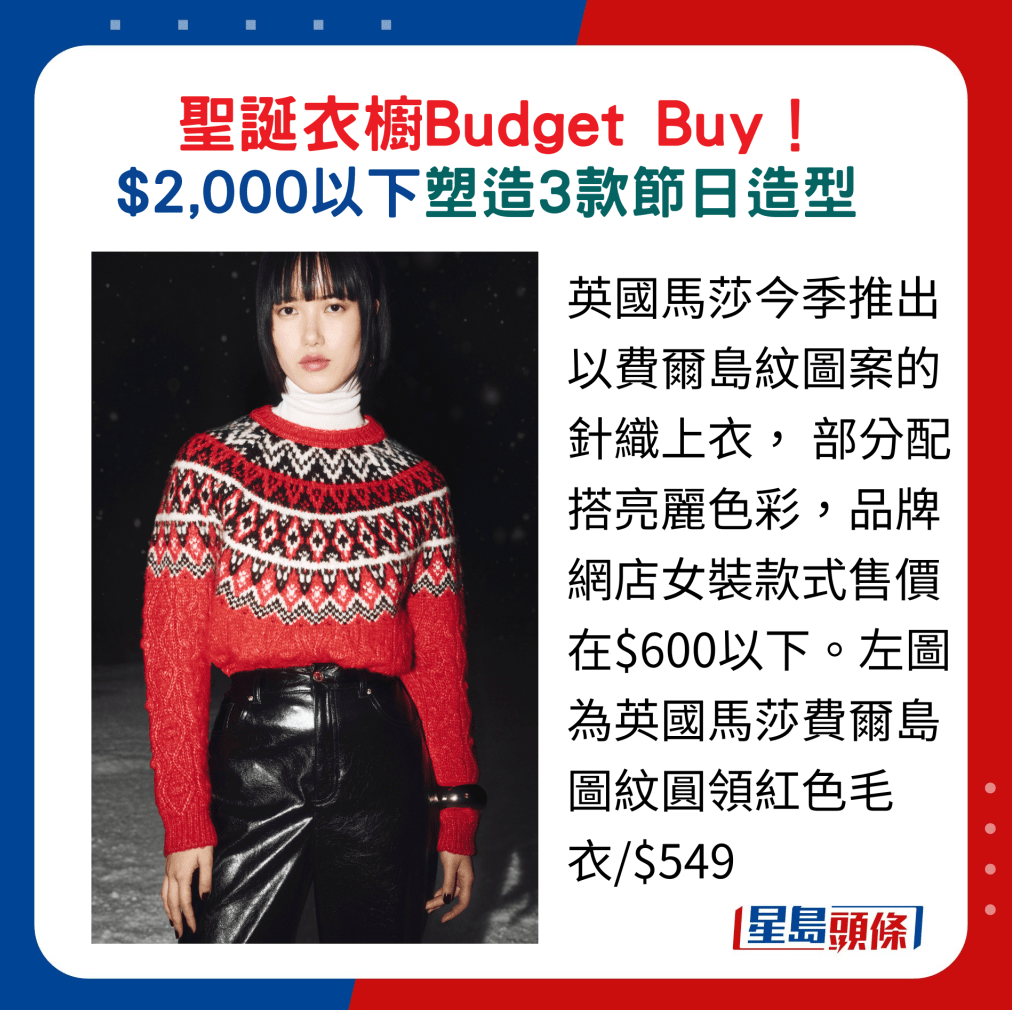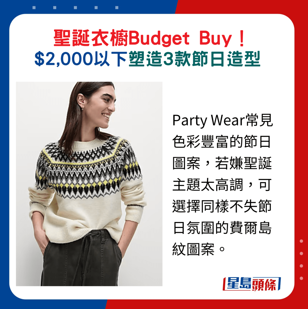 圣誕將至,少不了準備富佳節氛圍的服飾,時尚品牌的新作都可找到點題的設計, 如圖案、顏色與閃亮元素等。今日就為大家提供Budget Buy方案,不論喜愛隆重華麗又或時髦型格Style,全身衣著$2,000以下就有交易,輕松穿襯個人風格。