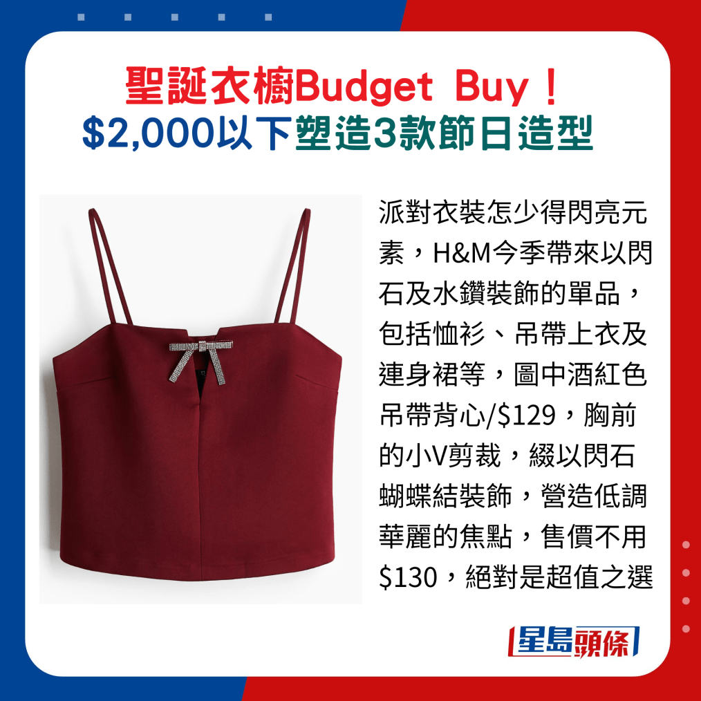 派對衣裝怎少得閃亮元素,H&M今季帶來以閃石及水鉆裝飾的單品,包括恤衫、吊帶上衣及連身裙等,其中一款設計簡約的酒紅色吊帶背心,胸前的小V剪裁,綴以閃石蝴蝶結裝飾,營造低調華麗的焦點,售價不用$130,絕對是超值之選。不妨配襯人造皮裙褲及長褲,而 ZARA就有一款黑色人造皮裙褲,只售$299,即時增添型格,跟Bling Bling裝飾的長靴或高跟鞋一拍即合。