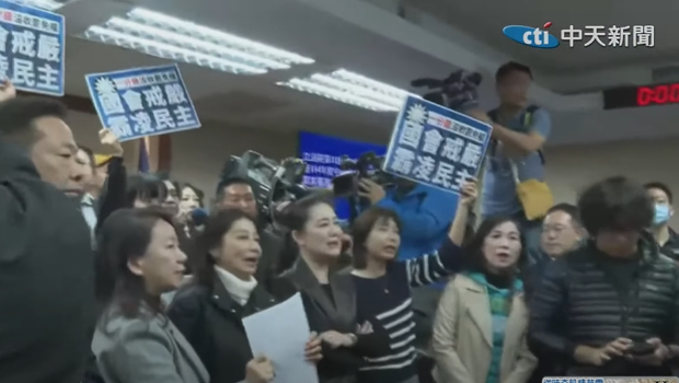 民進黨“立委”則高呼,“違法議事錄”、“違法會議、會議無效”、“國會戒嚴,霸凌民主”。蔡易余氣炸砲轟,“徐欣瑩來我們就是簡單要求仿照周一議事錄暫不確定,他還不敢答應,拿牌子說他們要開會,國民黨就是綁架預算,民主可以這樣被翻頁嗎?每次都綁架預算,把總預算當人質肉票國民黨還有臉說要開會?”