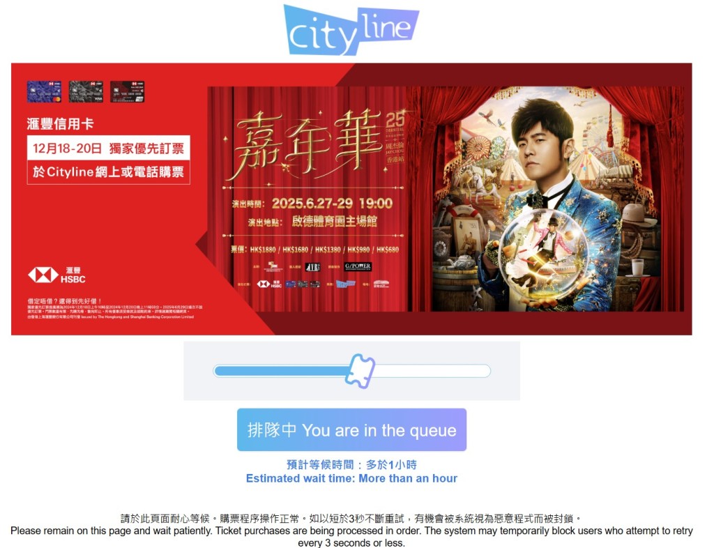 《星島頭條》記者今早10時準時進入Cityline購票網站,網站已顯示“排隊中”,預計等候時間“多于1小時”。 有網民10時20分在討論區留言,指購票頁面已顯示“temporary no ticket available(暫時無票)”,無法購買。 不過亦有網民表示用手機便已買到4張1680元門票。