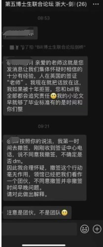 有浙大學生在聊天群組聲稱,“我已經達到畢業標準,如果因為老師的原因導致10年的簽證被拒簽,我將追究你的責任”。