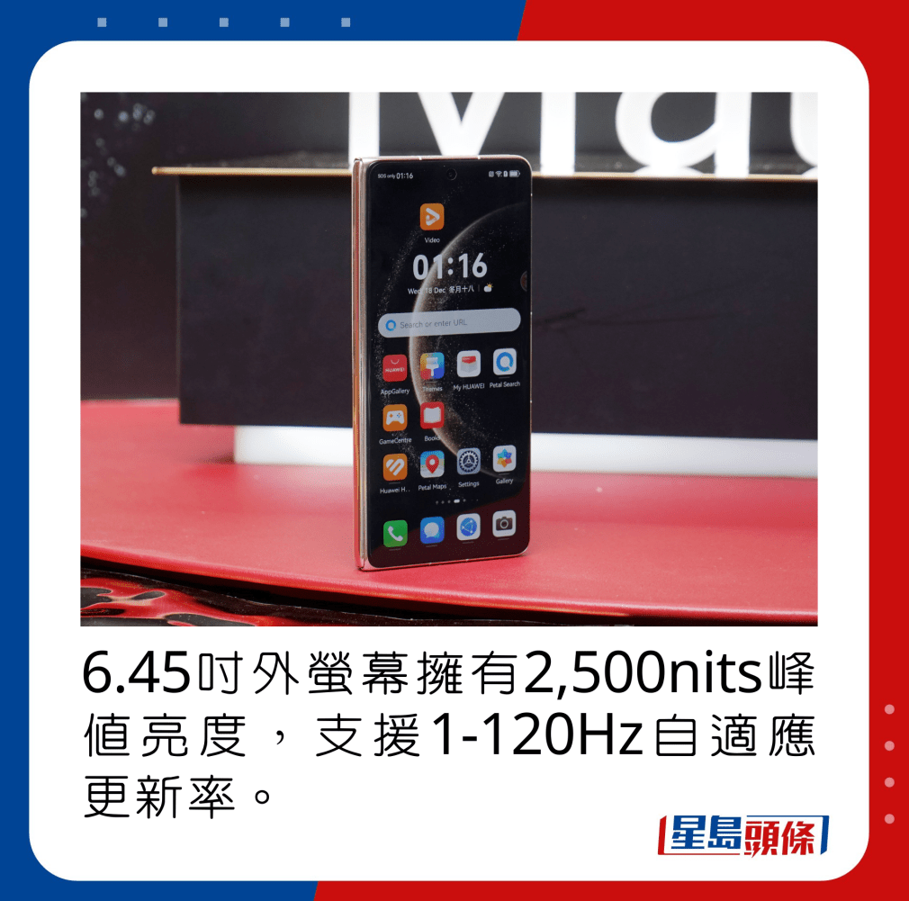 外觀上,Mate X6延續了上代對稱設計,機背鏡頭框內4顆鏡頭成方形排列,外圈則用立體鉆石切割工藝打磨,其中寰宇紅及曜石黑機背用上典雅素皮,星云灰則用上微納米3D拓印錦纖材質,賣相各具賣點。至于今代外螢幕與主螢幕畫面尺寸均有所增加,前者增至6.45吋,后者更達7.93吋,同樣采用自家X-True及HDR Vivid顯示技術,支援1-120Hz自適應更新率,峰值亮度分別為2,500nits及1,800nits,并具備1,440Hz PWM高頻調光。值得一提的是,外螢幕同時采用第2代崑崙玻璃加強硬度及耐刮表現。
