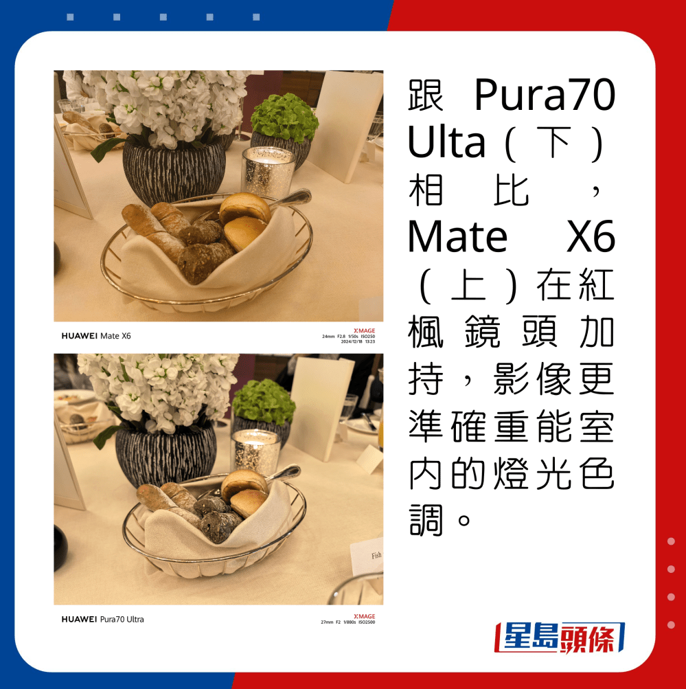 雖然Mate70系列未有推出國際版,但在Mate X6身上一樣可體驗到嶄新紅楓原色影拍效果,藉由設有150萬多光譜通道的紅楓鏡頭,捕捉環境光譜數據交給XMAGE影像系統處理,配合XD Fusion調節色準,不論廣角主鏡、超廣角或長焦微距,均能拍出近乎肉眼所見的色彩,無論自然景觀又或人像膚色,甚至複雜光源,仍能忠實還原拍攝時的境況,官方表示色彩還原度比上代提升120%,人物膚色、服飾都能呈現自然準確的色彩。話說回來,Mate X6配備可變光圈50MP超聚光主攝、40MP超廣角及48MP長焦微距,后者不但帶來4倍光學變焦,還可在近至5cm距離進行微距拍攝。