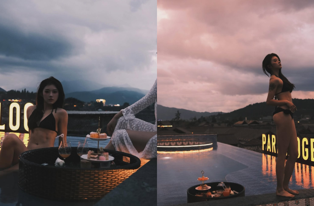 吳艷妮除了平時勤奮的訓練外,也非常懂得享受生活,日前她到云南度假時,看見飯店附設的無邊際泳池,搭配周圍的壯麗高山及交錯的古鎮屋脊,加上日暮時分的余暉,讓她立刻換上黑色3點式泳衣,站在泳池中一邊戲水、一邊欣賞當地獨有的美景,十分愜意。