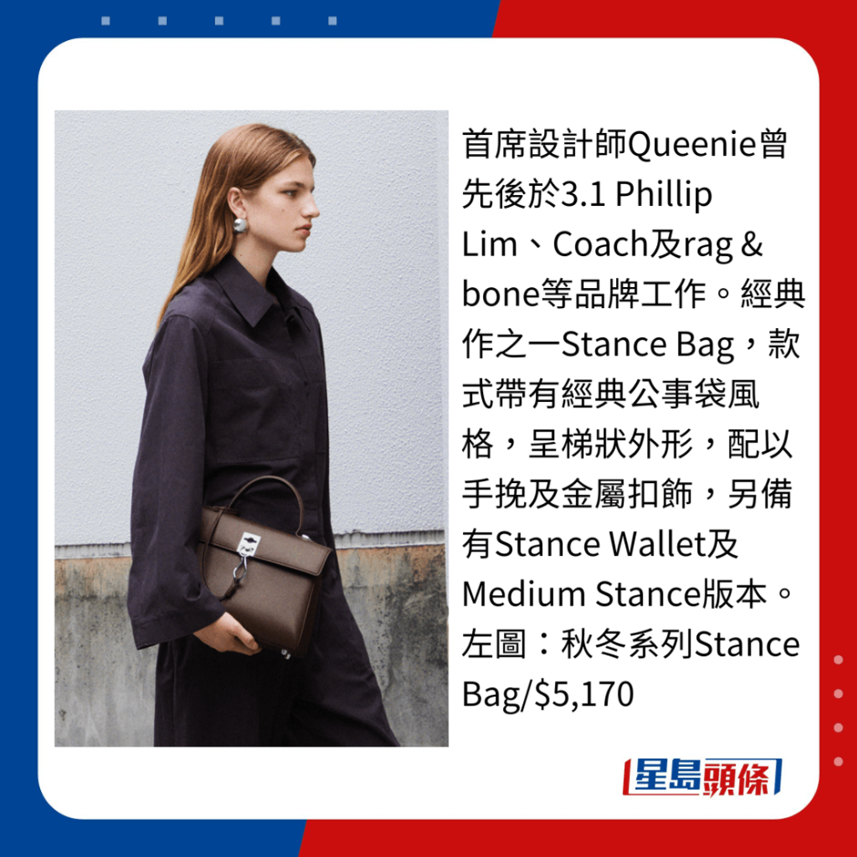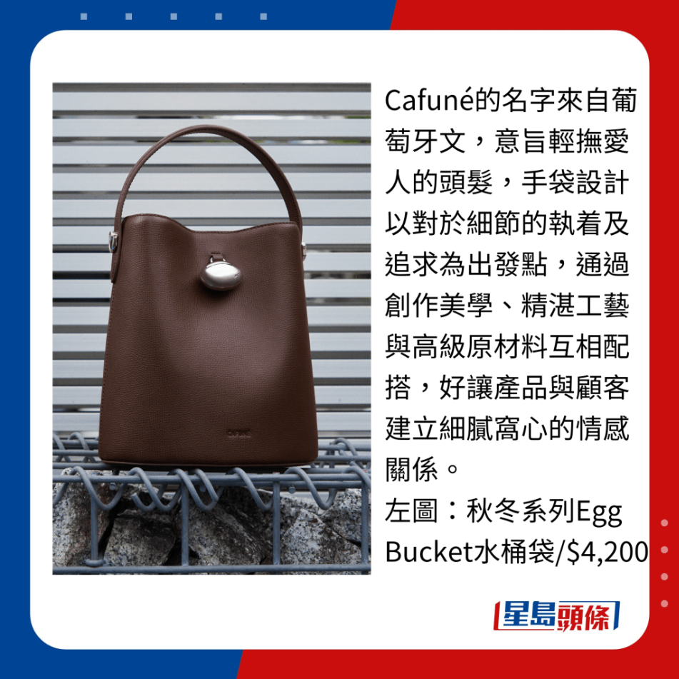 首席設計師Queenie曾先后于3.1 Phillip Lim、Coach及rag & bone等品牌工作。Cafuné年資雖短,卻獲得Lady Gaga、石原聰美及吳千語等不同地域的女星青睞。 經典作之一Stance Bag,帶有傳統公事袋風格,配以手挽及金屬扣飾,另備有Stance Wallet及Medium Stance版本。秋冬系列Stance Bag換上全新摩卡棕色,Stance Wallet則以意大利麖皮制作,提升質感。今季首度亮相的Asra Boston手袋,靈感來自獨立女性的生活,以頂級意大利小牛皮制成,手挽配搭跟標志性的Drop Duffel相同的金屬帶扣,令風格更一致。
