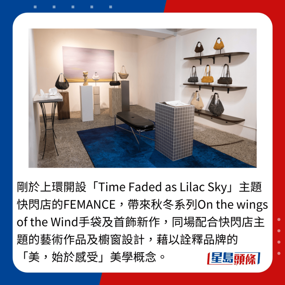 剛于上環開設“Time Faded as Lilac Sky”主題快閃店的FEMANCE,帶來秋冬系列“On the wings of the Wind”手袋及首 飾新作,同場配合快閃店主題的藝術作品及櫥窗設計,借以詮釋品牌的“美,始于 感受”美學概念。品牌由Angel Tam及Celia Ng于2019年創立,名字意指女性之間惺惺相惜的情誼。 創作核心圍繞獨特的設計、自然及以人為本,以不對稱輪廓與流線外形作為主打,好像油臘頭層牛皮制的Lympia手袋, 兩邊袋側用上一高一低的設計,外形獨特。 秋冬手袋設計寓意“自由的靈魂跟隨心中所向,活成向往的模樣”,如麖皮版 本的Wander Hobo Bag配以單邊折疊細節,營造隨意的不對稱視效。