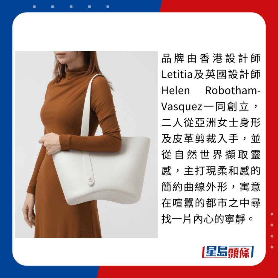 品牌由香港設計師Letitia及英國設計師 Helen Robotham-Vásquez一同創立,二人從亞洲女士身形及皮革剪裁入手,并從自然世界擷取靈感,主打柔和感的簡約曲線外形,寓意在喧囂的都市中尋找內心的寧靜。好像Nova小牛皮單肩袋,正是以兩塊大面積的完整牛皮拼合而成,打造出拱形的底部,營造簡約且獨特的線條美。