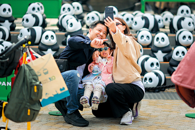 ▲不少內地旅客根據小紅書的推薦,到昂坪市集游玩,并在熊貓雕塑前打卡。