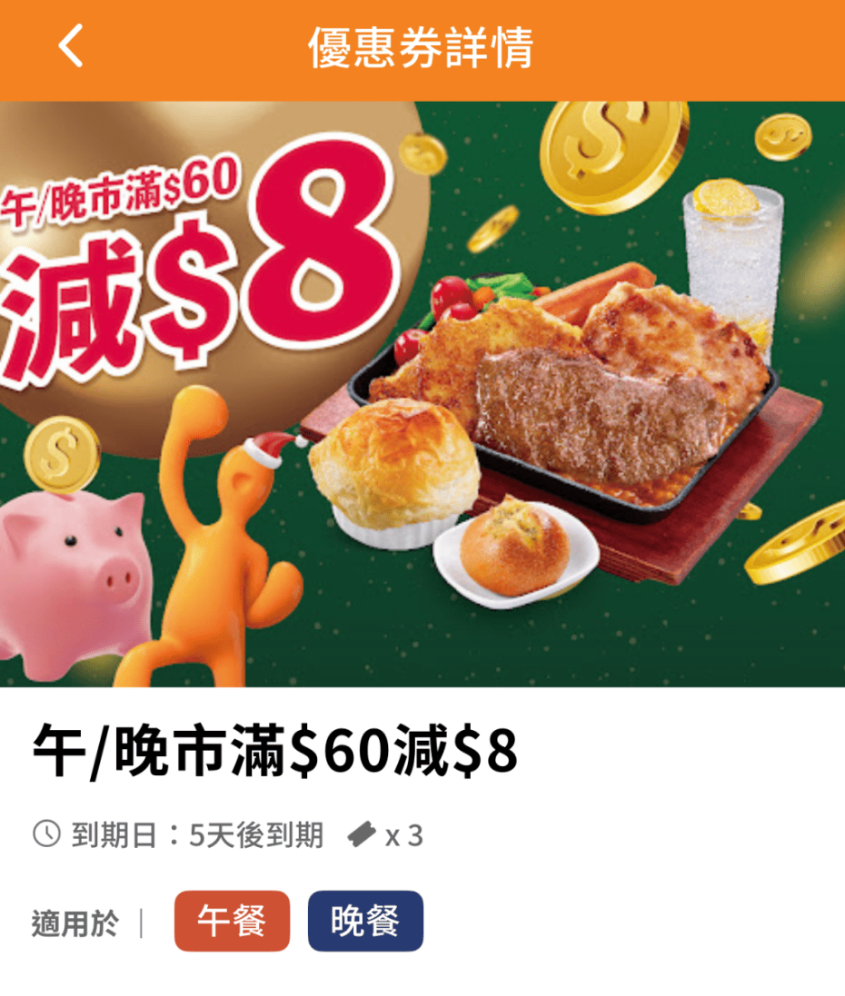 大快活同步推出午市及晚市優惠,由即日起至12月31日,會員可于大快活APP內領取3張“早/茶市滿$60減$8”電子優惠券,于午市11:30am至2pm或晚市5:30pm后的時段內買滿$60,即可慳$8,每次使用一張。精選午餐包括有日式燒汁牛肉飯、爆“抵”雙餸碗、港式雞髀餐等,而晚餐推介則有鐵板餐、古法羊腩煲、阿活煲仔飯等。