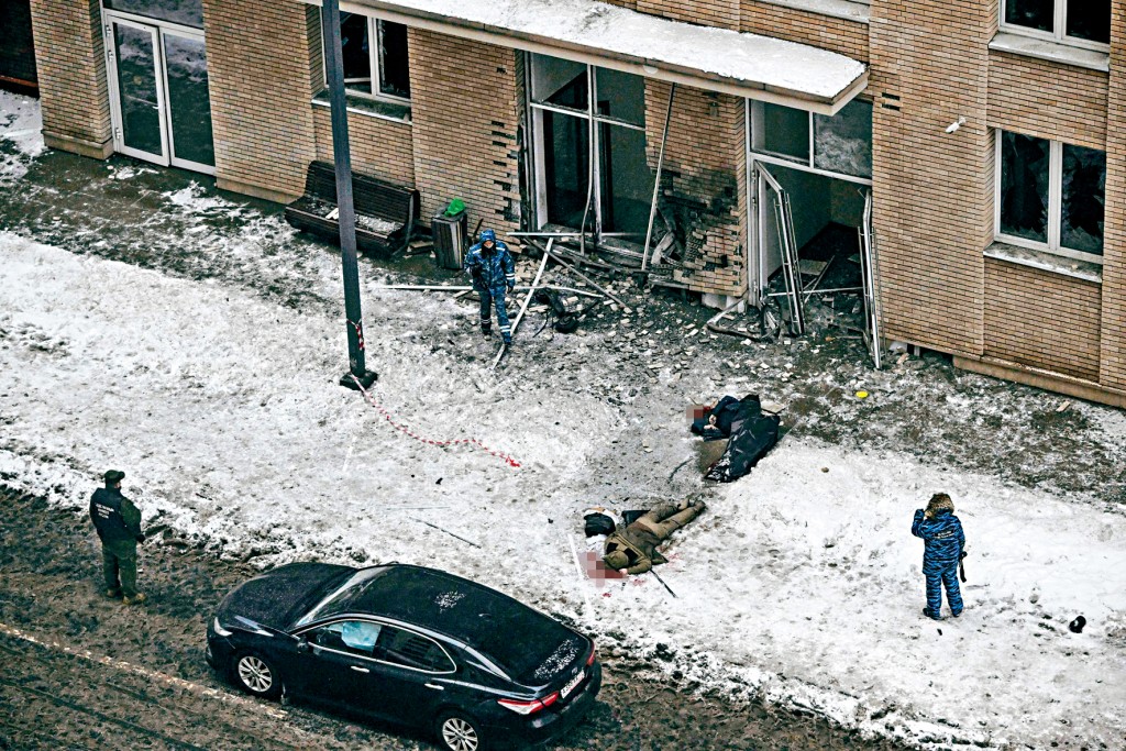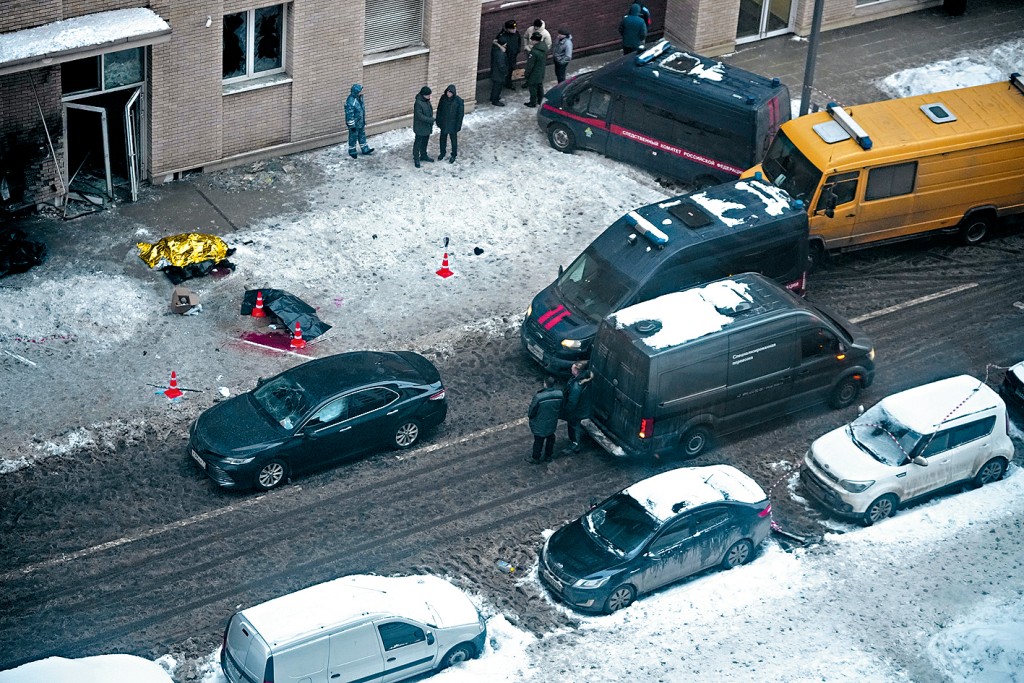▲在莫斯科一棟住宅大樓外,基里洛夫中將(黑衣)及其助手的尸體臥在雪地上。
