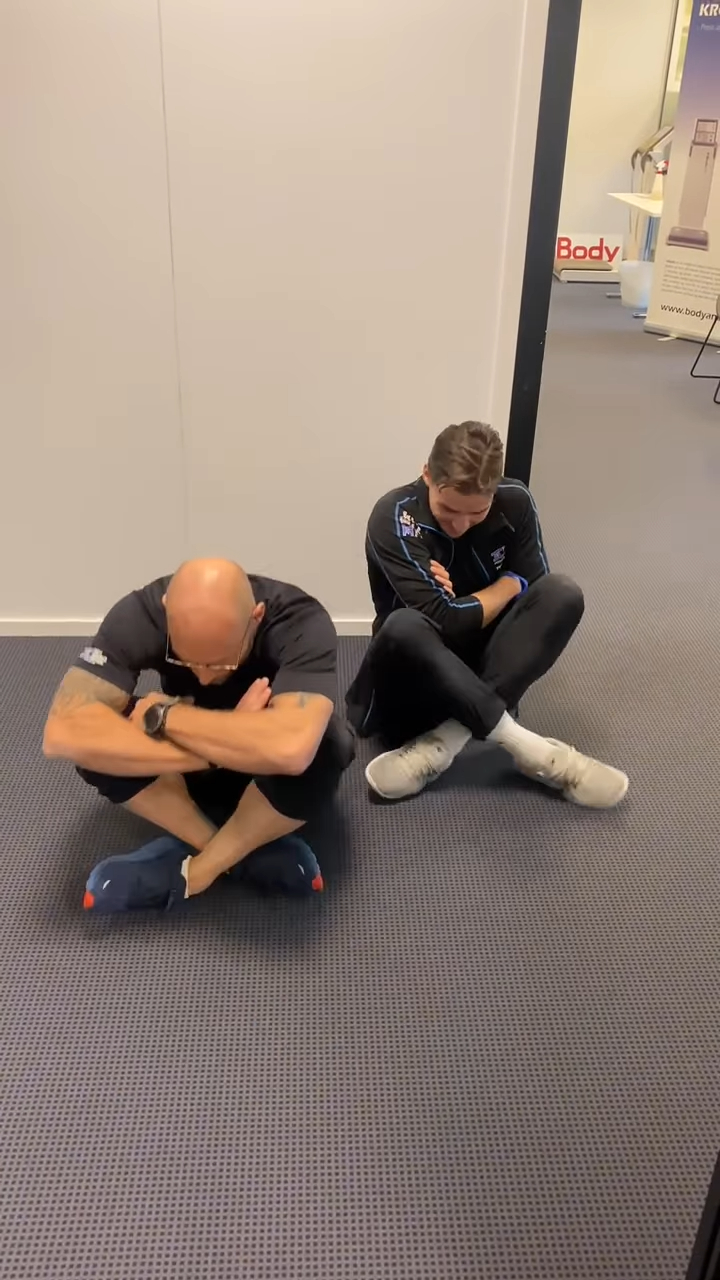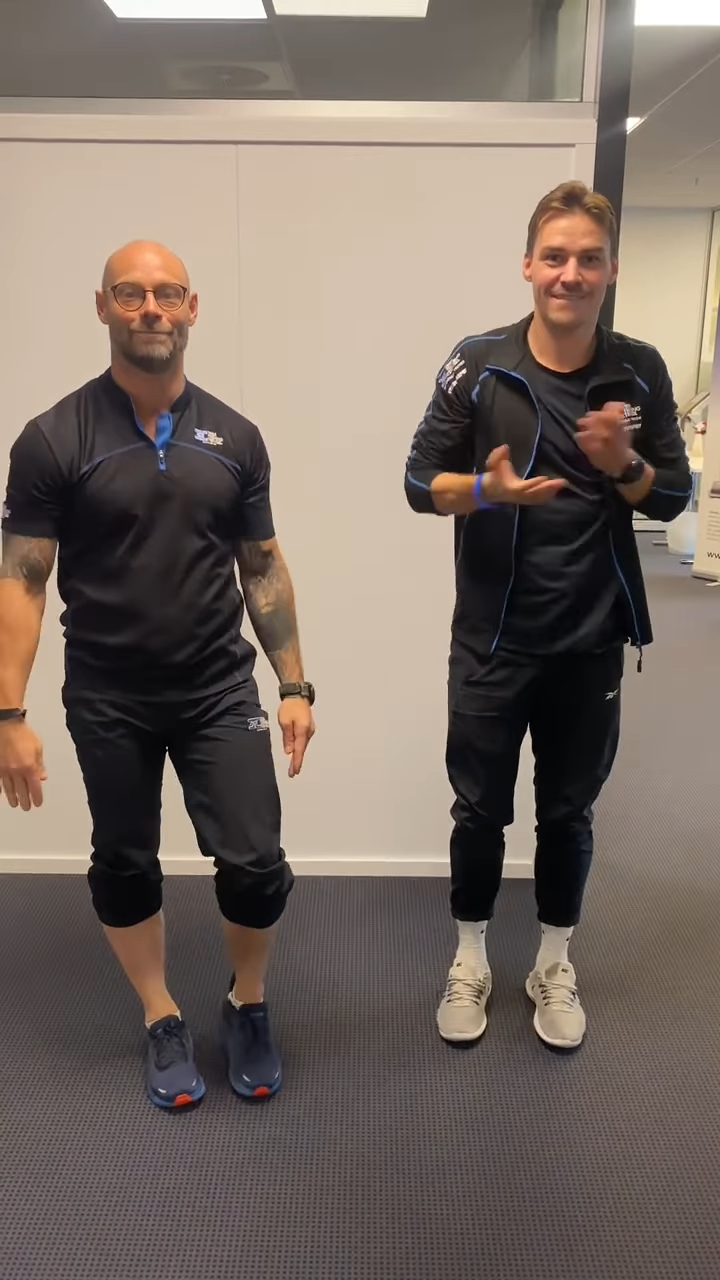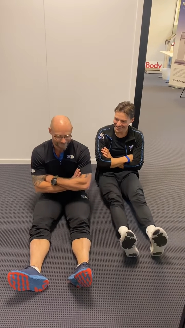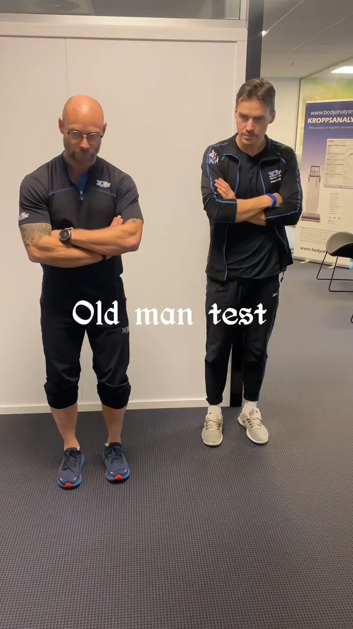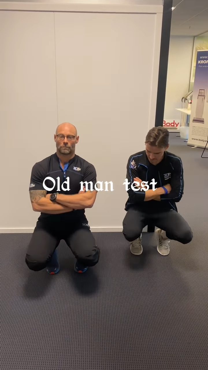 挪威健身室Trim Trening Trivsel在社交平臺發布一段短片,兩名健身教練在片中示范一段動作,可判斷自己身體是否已踏入“老人體質”的階段,此測試需要運用核心及腿部力量。