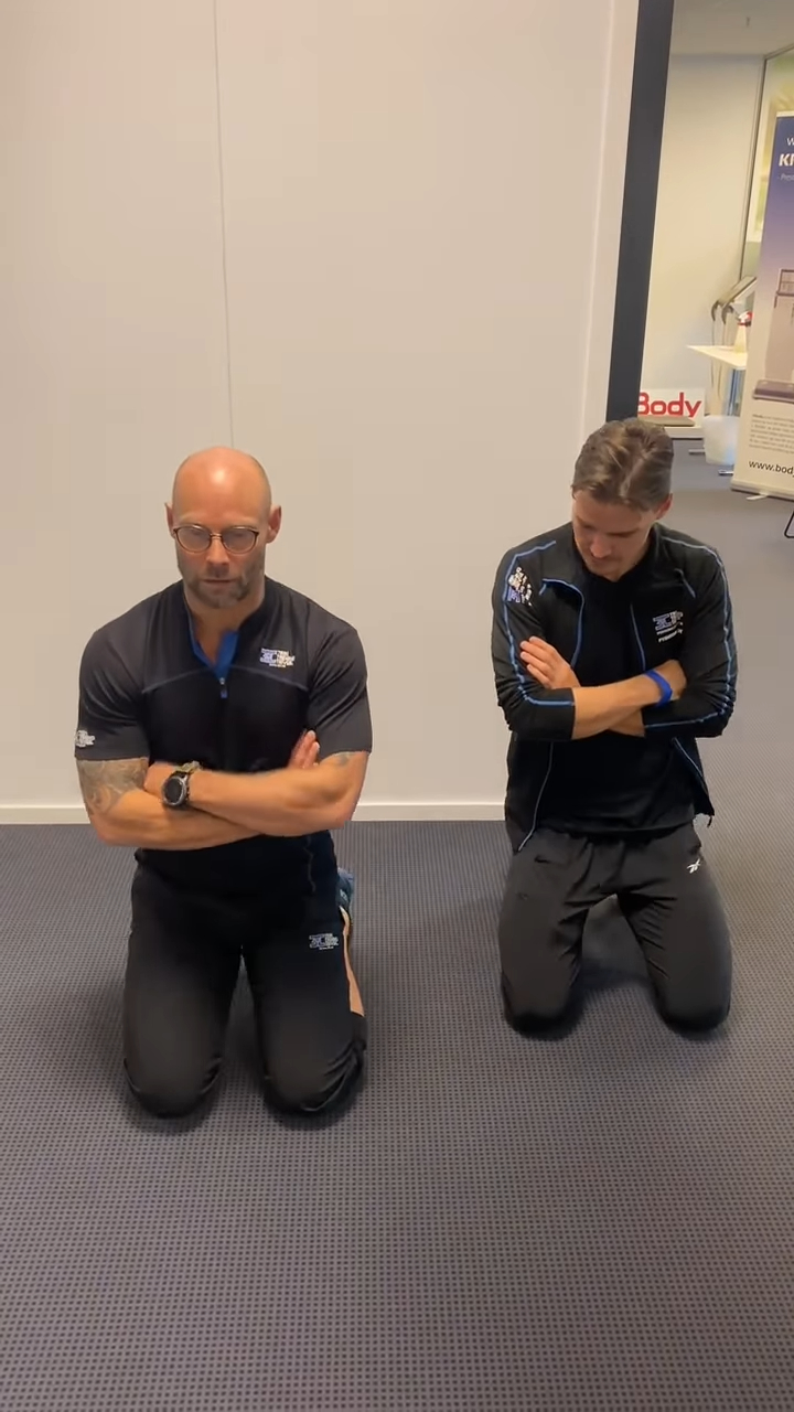 ▲1. 雙手交叉,放在胸前,保持站立姿勢(影片截圖:3ttrening@IG)