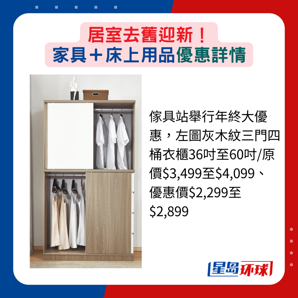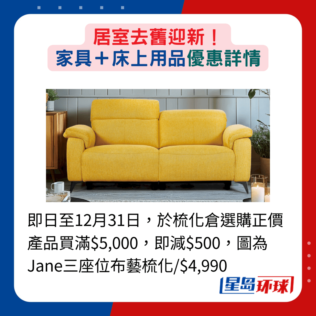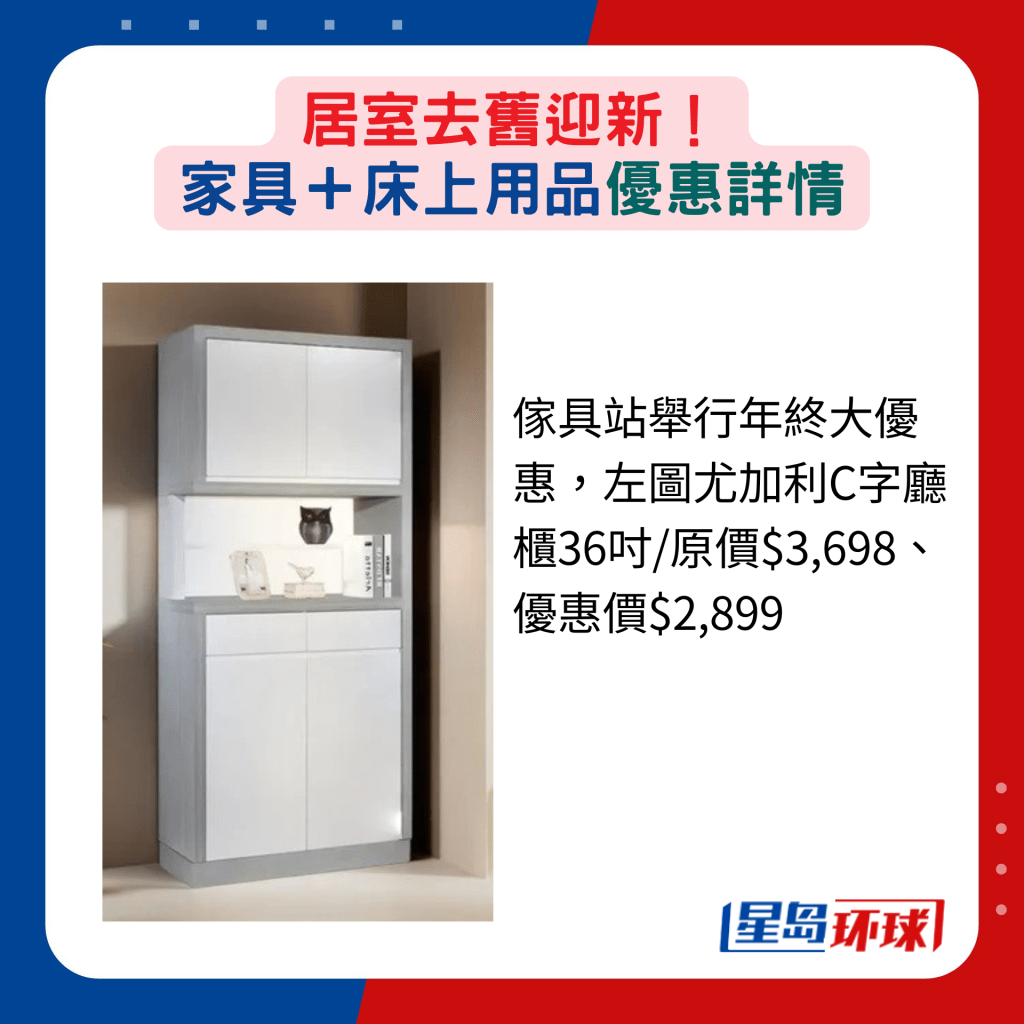 主售沙發及家居產品的梳化倉,包羅各款歐洲名牌、智能彈鉸、寵物布料沙發,以及餐桌椅等。由即日至12月31日,只要選購正價產品滿$5,000即減$500,買滿$10,000即減$1,000。同樣舉行年終大優惠的家居站,部分產品就低至半價,如灰木紋三門四桶衣柜36吋/原售$3,499,現以優惠價$2,299發售,又或C字廳柜36吋/原售$3,698,現以$2,899便有交易。